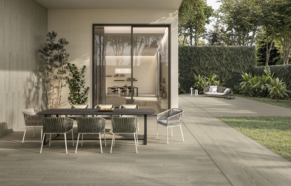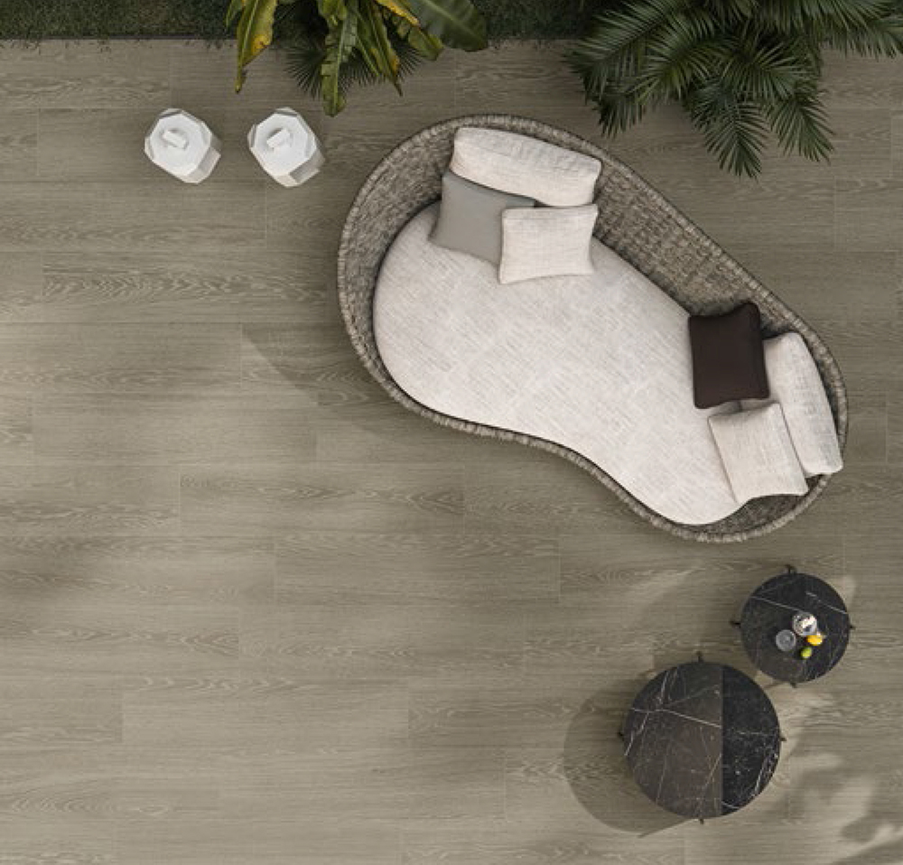 Sawn」強調的是鋸切紋理,比起一般的木紋磚,它更有觸感上的深度和層次感,適合營造極簡但具細節的現代風格。