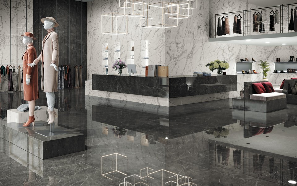 它結合了天然灰色大理石的高雅質感與瓷磚的高耐用性、低維護成本等優點。
