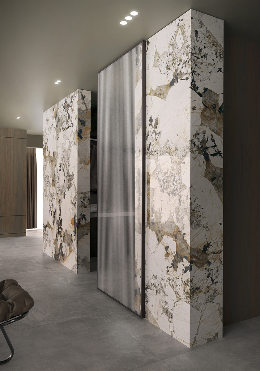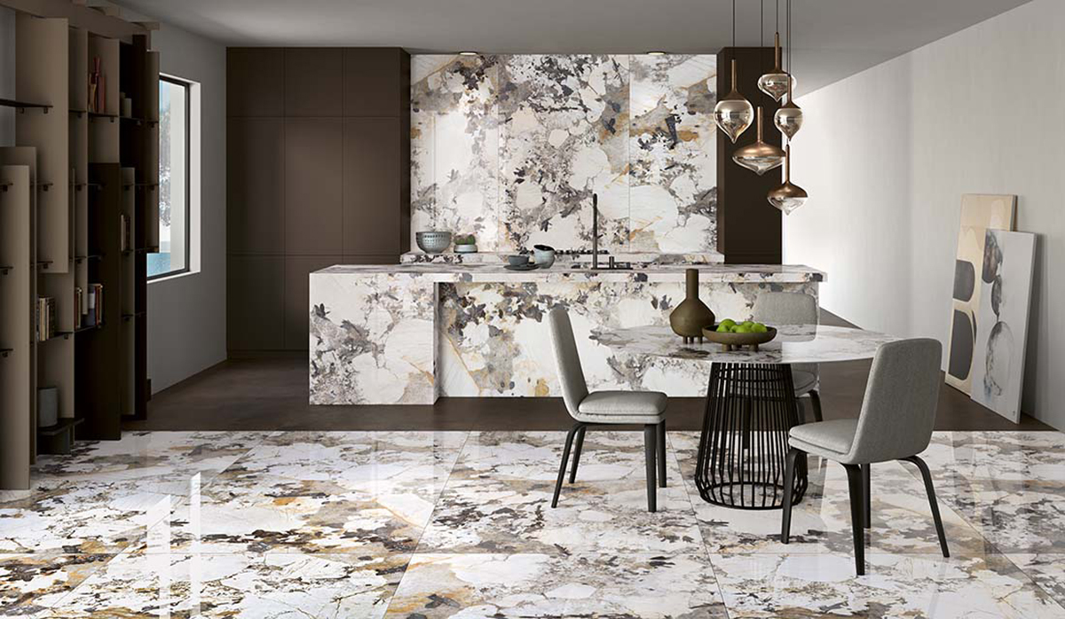 在溫潤如玉的米白色底蘊中,交織著半透明的結晶感與狂放的深色礦脈。那些紋理,像是冰川消融後留下的遠古印記,又像是大地的裂痕被注入了流動的黃金。